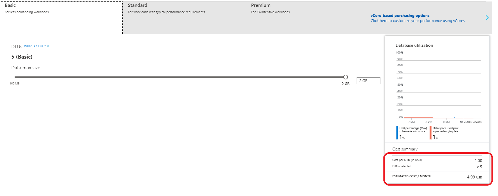 Azure SQL数据库有许多价格层,如果数据库不是很大,则可以更改为基本价格层,一年后只需要4.99美元/月: