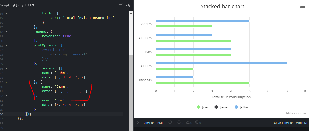 请注意,这两个系列吐露有很大的不同。在第一个数据中,数据是一个空字符串数组,而在第二个数据中,数据变成了一个对象数组,其中y被设置为空字符串。如果要在列中执行相同的操作,则会发生相同的错误-请参阅:http://jsfiddle.net/8rsywuc7/