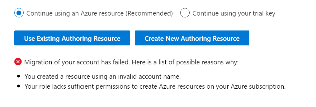 我无法访问我的LUIS模型,也无法在eu.luis.ai上完成迁移。错误信息是:您的帐户迁移失败。下面列出了原因:您使用无效的帐户名创建了资源。您的角色缺乏在Azure订阅上创建Azure资源的足够权限。