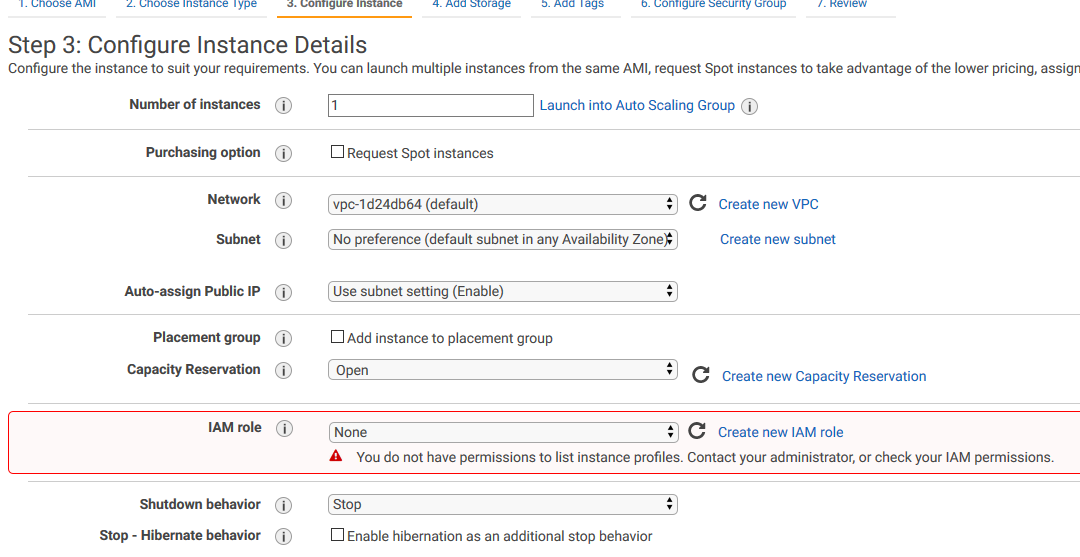 您没有列出实例配置文件的权限。与管理员联系,或检查您的IAM权限。