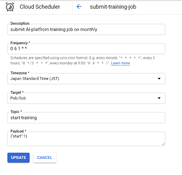 最简单、最具成本效益的方法是使用云调度器和具有云功能的人工智能平台客户端库。