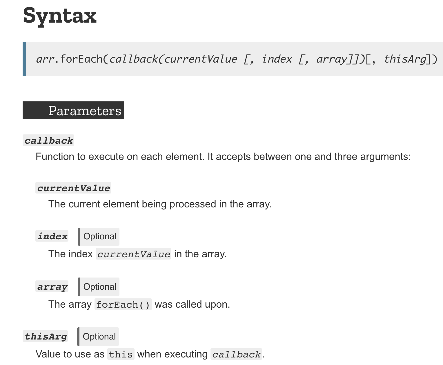 文档似乎表明,在forEach方法中,回调函数是强制参数,而currentValue是回调函数的强制参数:
