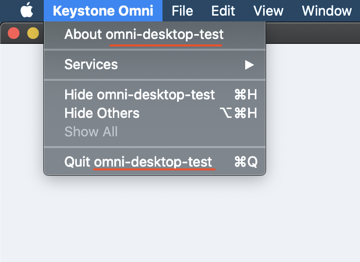 我能够设置.app包名,以及显示在顶层菜单中的名称,但出于某种原因,package.json name字段仍然应用于两个区域(见下图)。我打开应用程序包查看Info.plist,但没有看到任何'omni-desktop-test'实例。