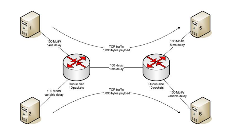 我想在NS2中模拟上面的网络,如您所见,节点2和6具有可变延迟的链接。这些可变延迟应该是5ms到25 5ms之间的随机值。
