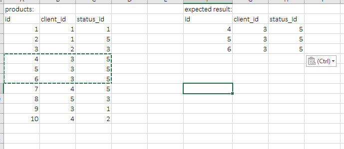 有一个产品表,其中包含client_id和status_id字段,如何获取其状态没有签署产品状态并具有封闭产品状态的客户端。