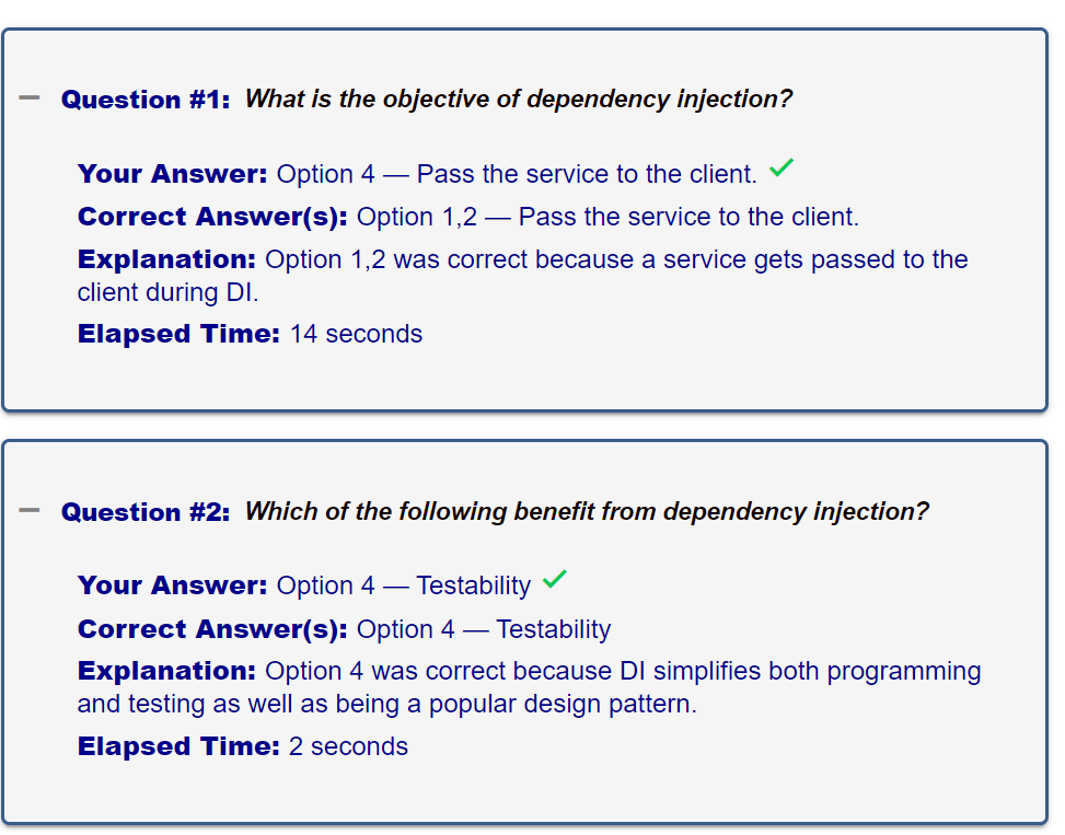 在测试应用程序时,用户的答案选项数有时似乎与正确的选项文本不一致;对于正确的答案也是如此。在选择题中,在正确的答案和解释中,选项应该显示为"1和2",而不是"1,2“。我已经将正确的选项字符串(带有"1和2")传递给ResultsComponent,但在遇到一些M/C问题时,它可能应该是一组正确的选项。在测试中,有时当用户的答案和正确的答案不同时,即使用户的答案不正确,也会显示正确的复选标记。
