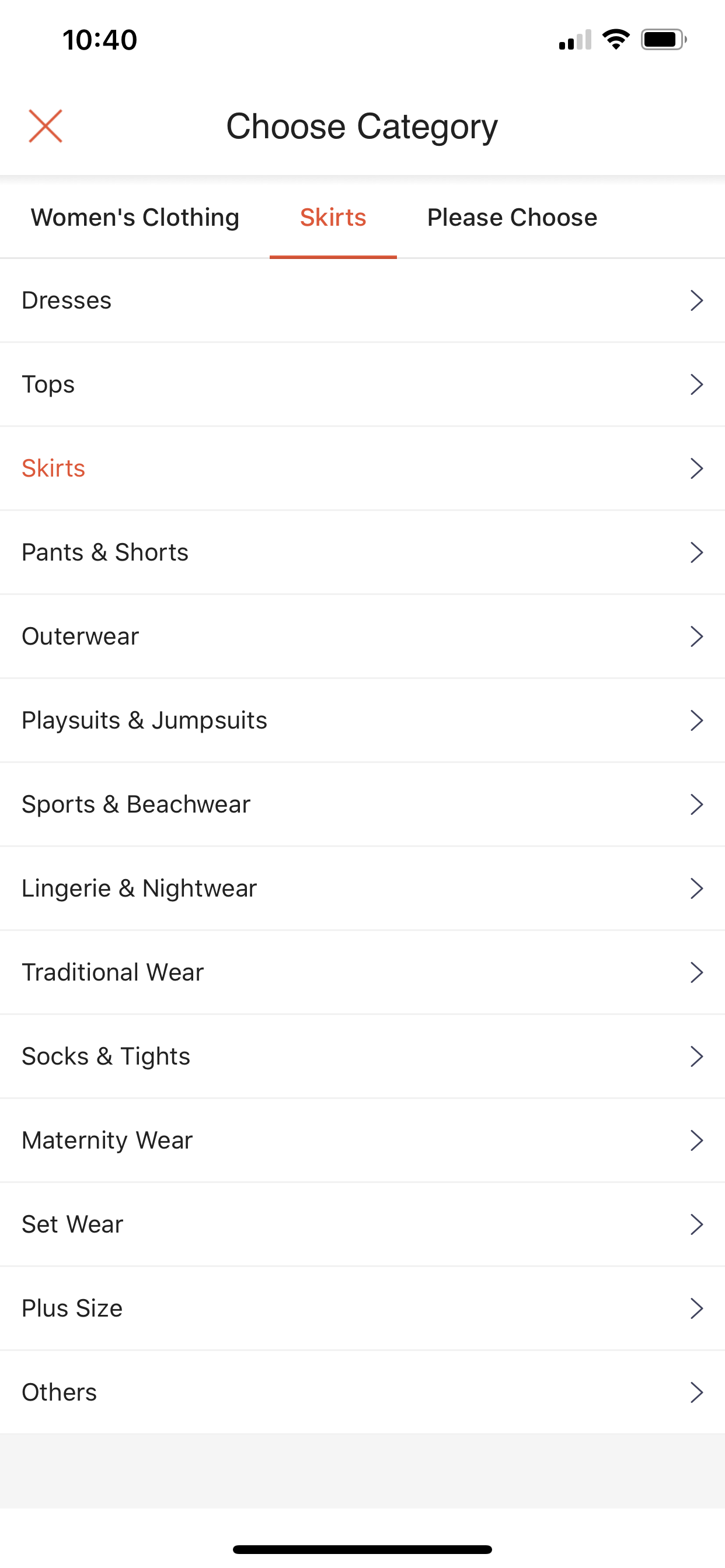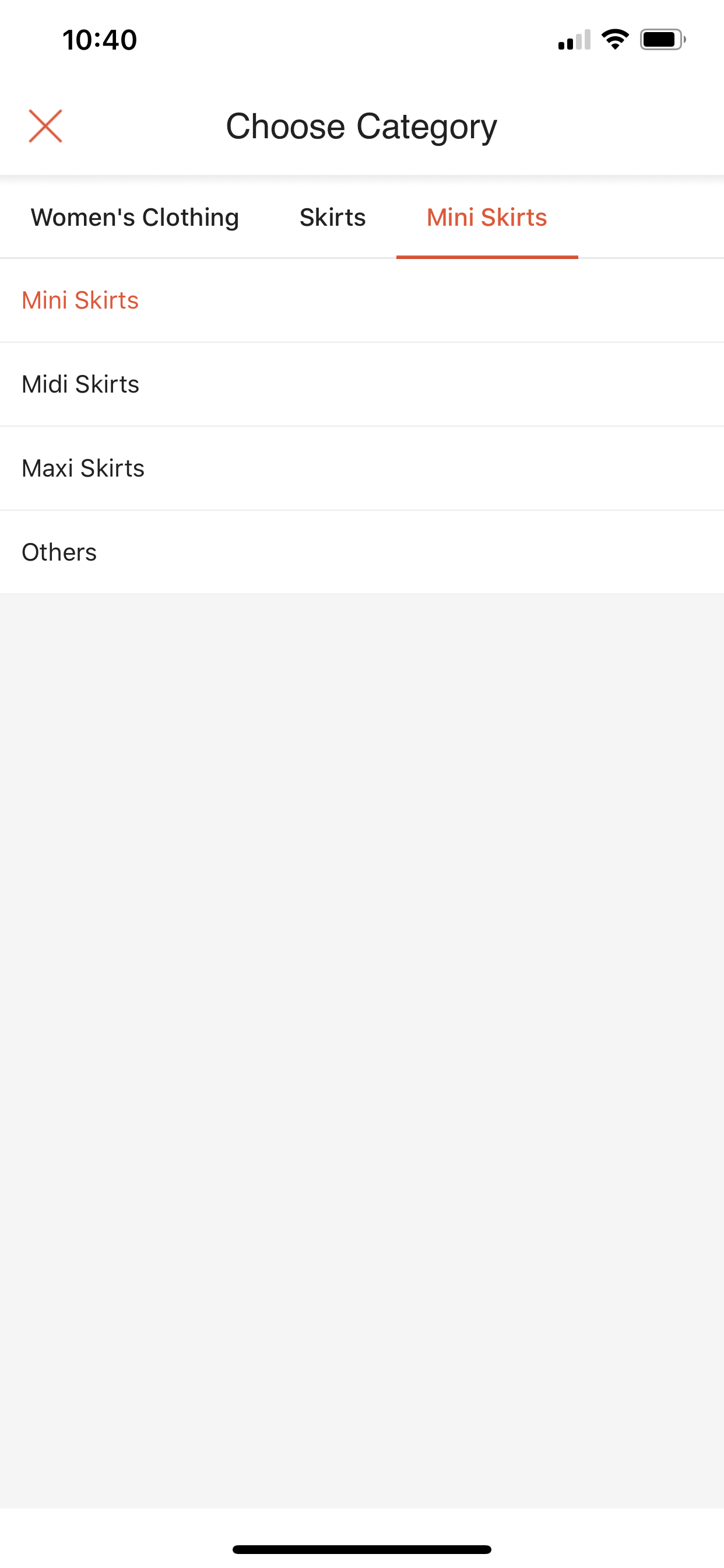 出现的选项卡名称将根据您选择的类别而定。如果您向后导航从“裙子”到“妇女”,标签名“裙子”将消失,只显示“妇女”和一个占位符标签名“请选择”。