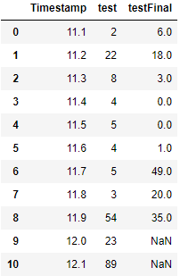 df = pd.DataFrame({'Timestamp':[11.1,11.2,11.3,11.4,11.5,11.6,11.7,11.8,11.9,12.0,12.10],