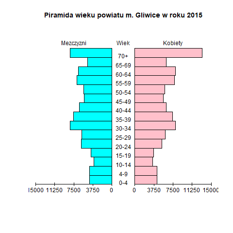 Lcol="Cyan", Rcol="Pink", Ldens=-1, Rdens=-1,main="Piramida wieku powiatu m. Gliwice w roku 2015")
