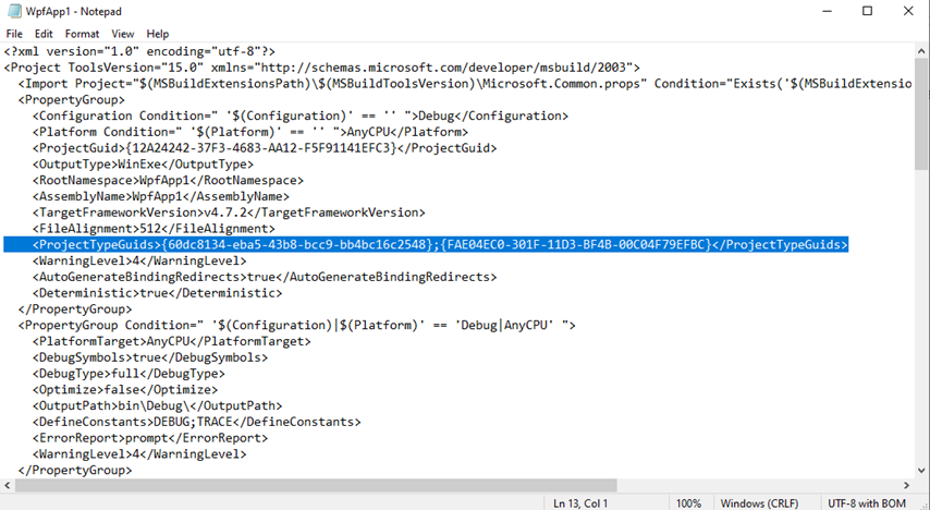 我创建一个wpf项目并打开.csproj文件。