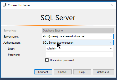我在Azure中有一个SQL Server,它是使用一个简单的ARM模板创建的。当我使用sqladmin凭据连接到Server时,我可以使用很好地连接到它。为此,我使用。
