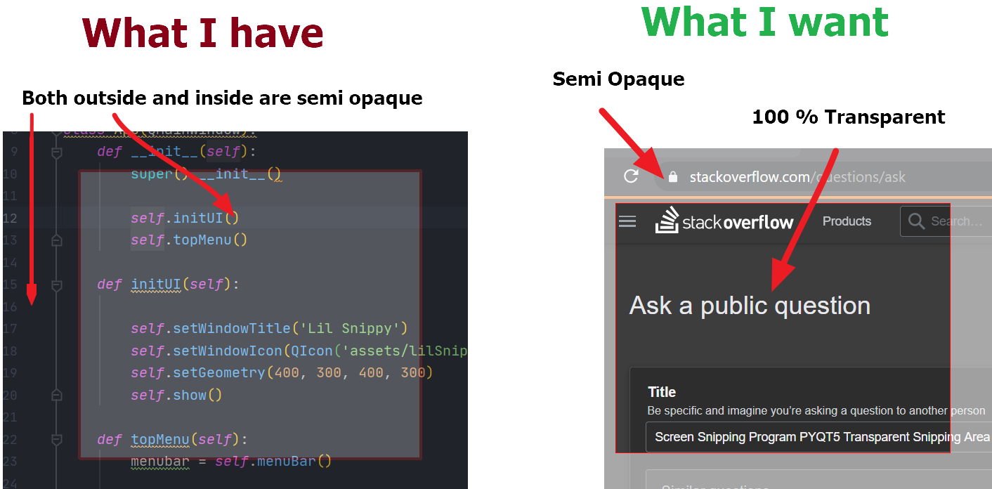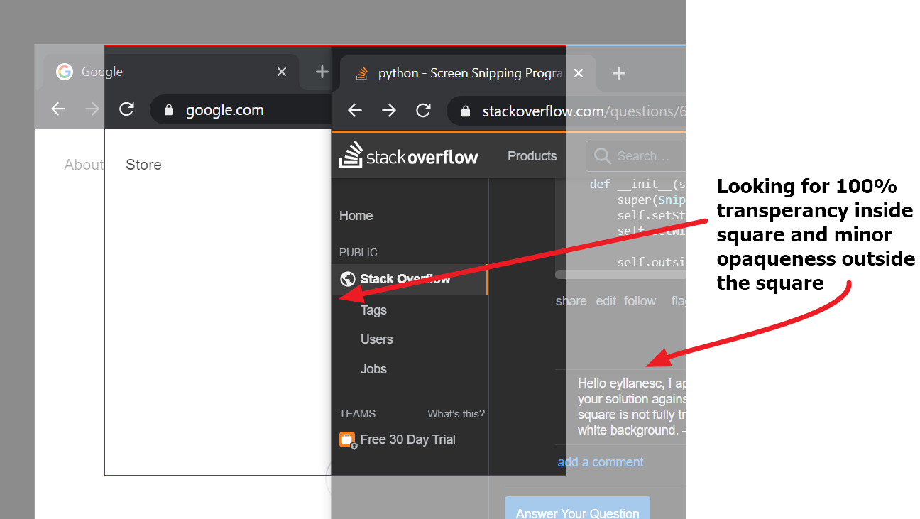 我正在将我成功的屏幕截取程序从Tkinter转换到PYQT5。我的问题是如何创建一个完全透明的狙击区域(动态更新的正方形区域会很好)。广场的外面将是半不透明的。我查看了所有的堆栈溢出和互联网,找不到这方面的一个例子(其他不是一个完全透明的绘图窗口)。我已经附上了我的代码和一个图片的例子,我正在寻找什么。"SnippingWidget“是执行切分逻辑的类。