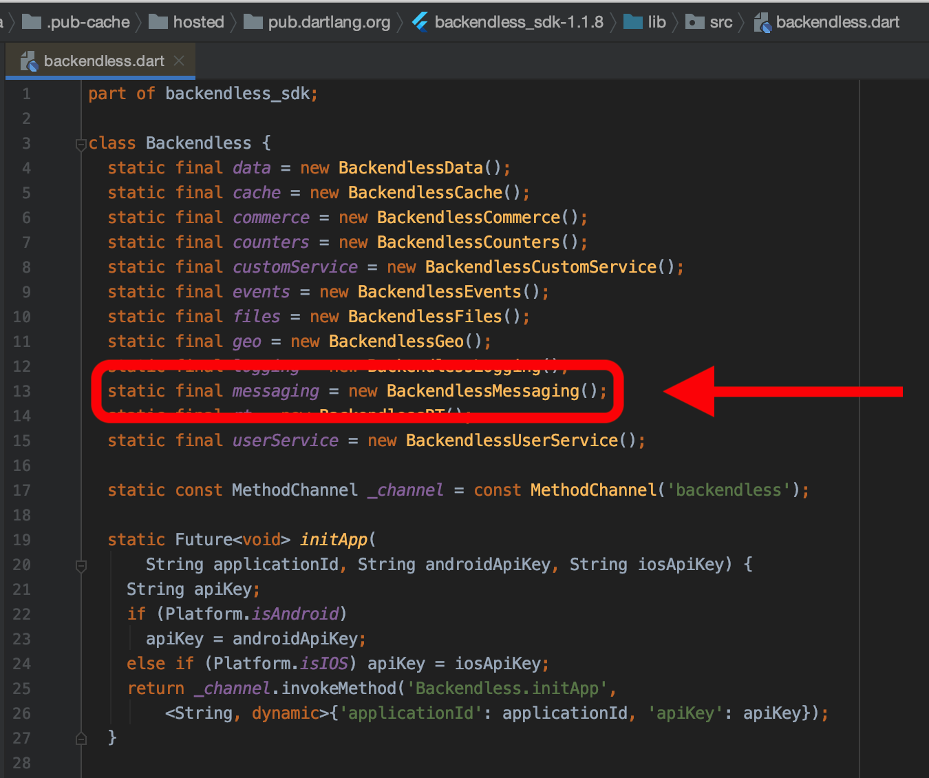 The getter 'Messaging' isn't defined for the type 'Backendless'.