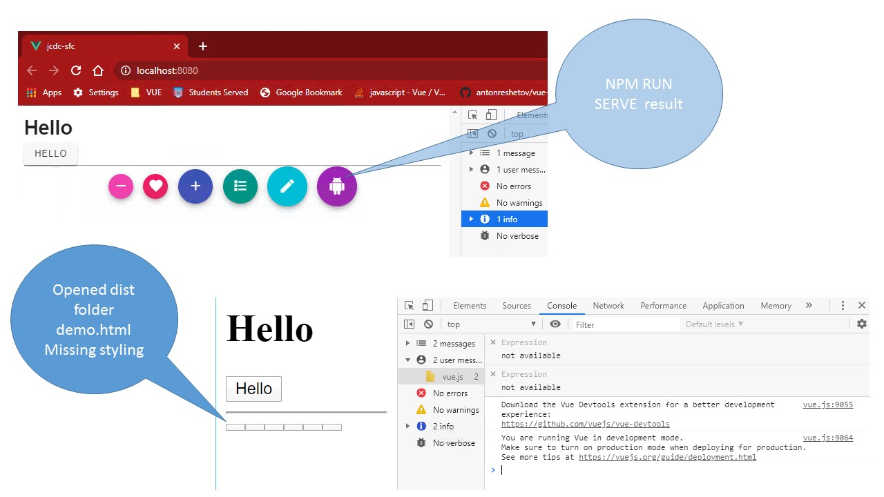 我们的计划是为我们的内部团队创建组件以供使用--没有NPM。我创建了hello-world.vue组件,并从package.json运行了一个脚本(如下所示),以便使用该组件创建一个dist文件夹。这是相当好的工作,但在另一个应用程序demo.html或类似的Vuetify -btn没有任何样式从vuetify.脚本根据vue文件创建各个组件。执行脚本生成组件"buildSFC":“交叉env vue-cli-service构建-目标wc -名称jcdc-sfc / components /*.vue‘”