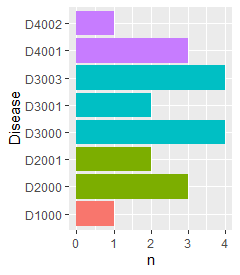 下面是我如何绘制条形图。从D4开始的所有疾病都有相同的colors.All,以D3开头的疾病也有颜色。诸若此类。现在我希望疾病标签出现在图表上,而不是它们的代码上。