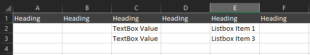 对于范围中的每个单元格,记住我们的范围从下一个空白行设置为Column C,将TextBox值写入列C,将数组中的每个ListBox项值写入列E。当循环迭代时,确保将下一个数组元素写入列E的ArrayItemCounter增量与每个循环一起。