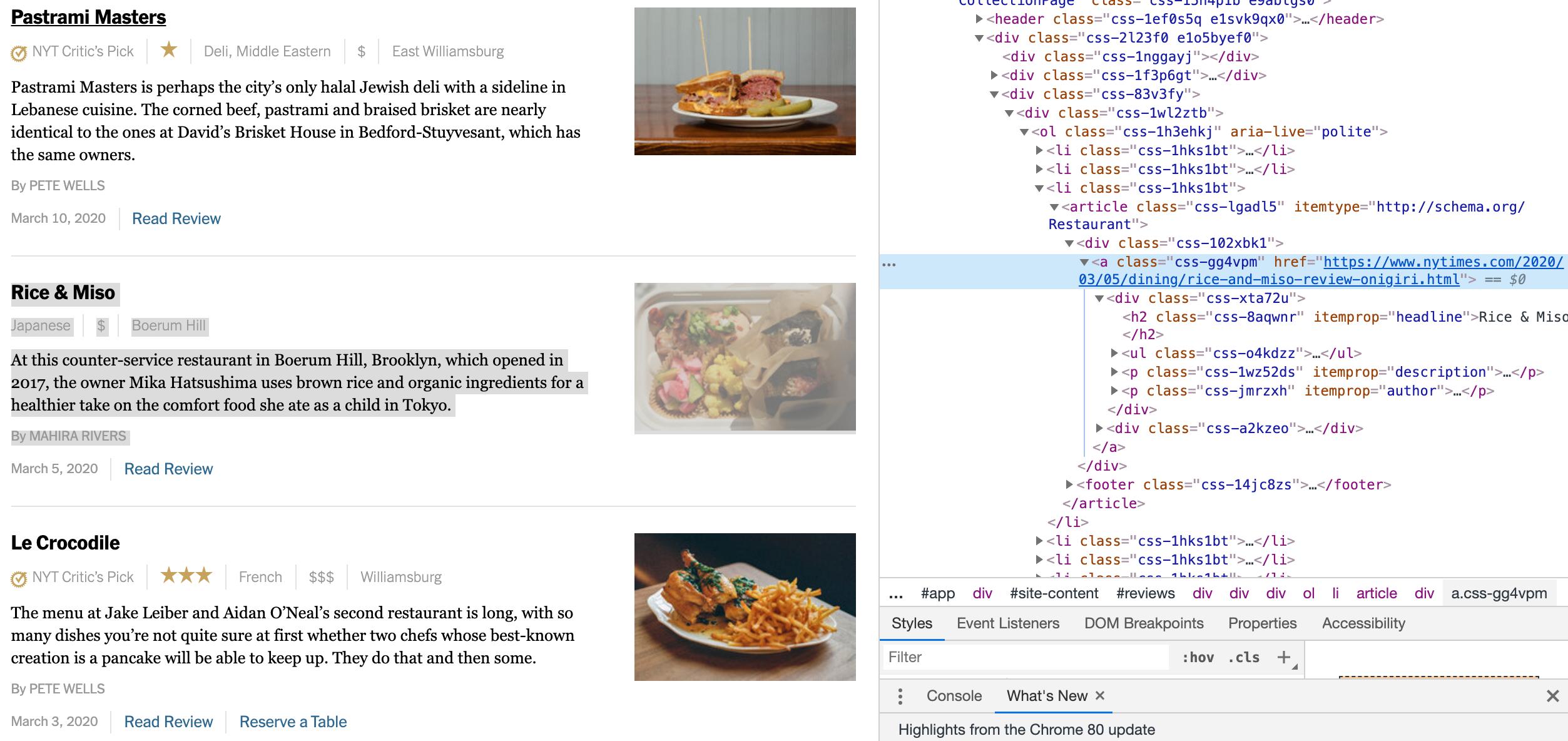 转到https://www.nytimes.com/reviews/dining按F12,然后按Ctrl+Shift+C以获取元素显示更多的,然后如我在图中所示,获取元素的xpath: