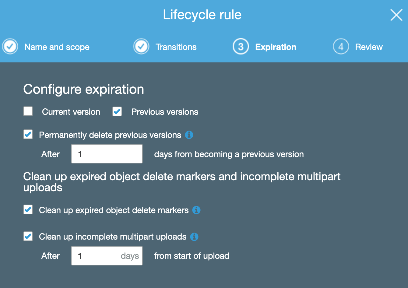 我浏览并删除了一堆对象(使用UI编辑:和生命周期规则),并且能够验证生命周期规则在间隔1天之后确实永久地删除了原始对象,但是它们的删除标记(现在技术上是过期的对象删除标记)仍然存在。已经5天了,删除标记仍然保留。为了使删除标记也被永久删除,还有什么需要做的吗?