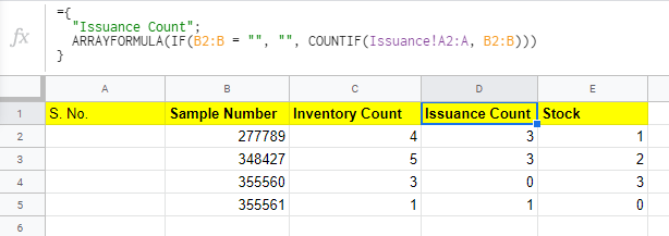 ARRAYFORMULA(IF(B2:B = "", "", COUNTIF(Issuance!A2:A, B2:B)))