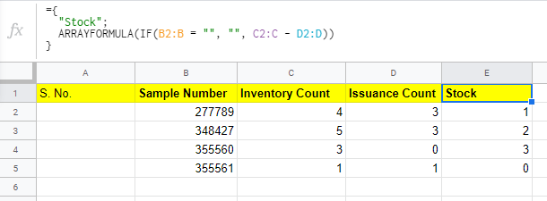 我有两张单张,分别是库存和发行数量,它们都有样品编号和数量。我想保持第三个股票表,将显示样本号码,它的库存数量,发行数量和股票数量。存货盘点就是存货盘点--发行盘点。