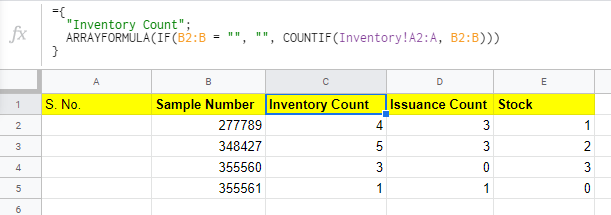 ARRAYFORMULA(IF(B2:B = "", "", COUNTIF(Inventory!A2:A, B2:B)))