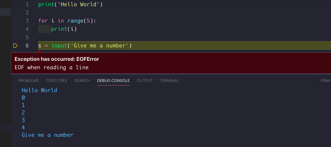 不幸的是,如果您的Python代码使用并要求用户使用手动input(),则使用调试控制台和internalConsole解决方案将无法工作。它将显示此错误: