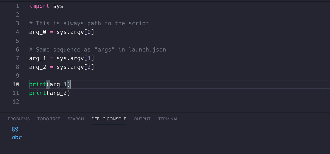 <path/to/python/interpreter> <path/to/python/file> [args]在"args"文件中使用launch.json选项。下面是一个使用sys.argv的简单示例