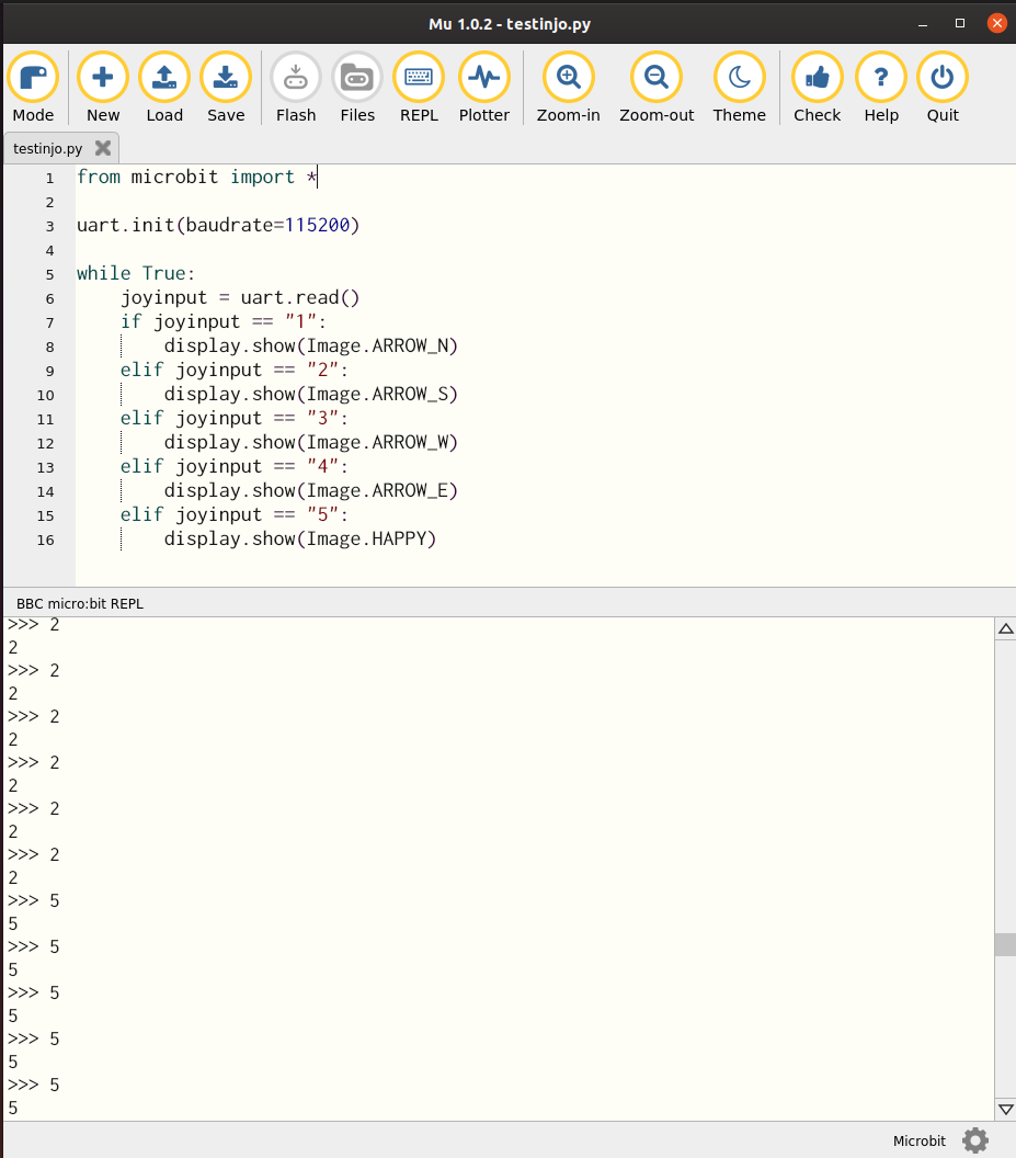在Mu编辑器的REPL控制台中,我可以看到通信进行得很好,也就是说,只要我按住某个按钮或操纵杆轴移动,我就可以得到具有适当编号的REPL:
