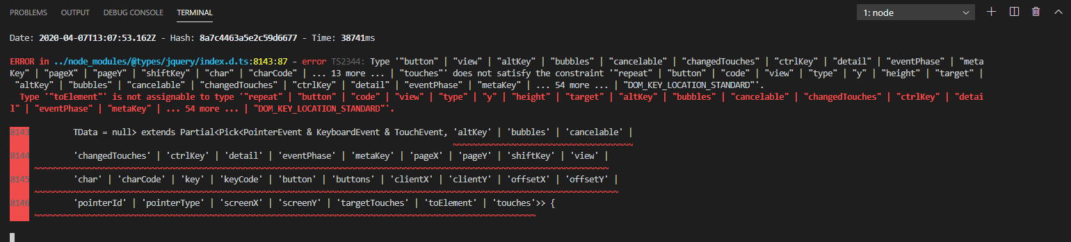 类型记录模块@type/jquery抛出一个错误,因为jquery不能很好地处理当前的类型记录版本。我们可以降级类型记录的版本,或者如果我们计划使用最新版本的类型记录,安装最新版本的@type/jquery将解决这个问题。