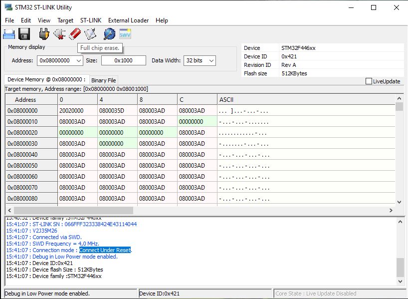 我与板与“连接下重置”之后,我做了“全芯片擦除”选项。