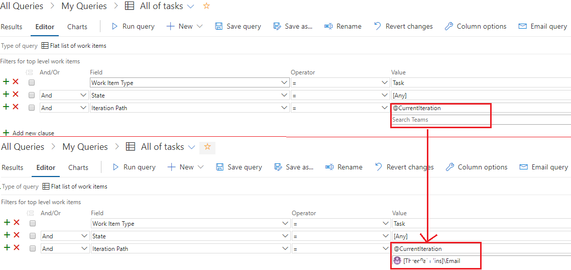 在查询中使用@CurrentIteration宏时,我们可以指定一个团队,如下所示: