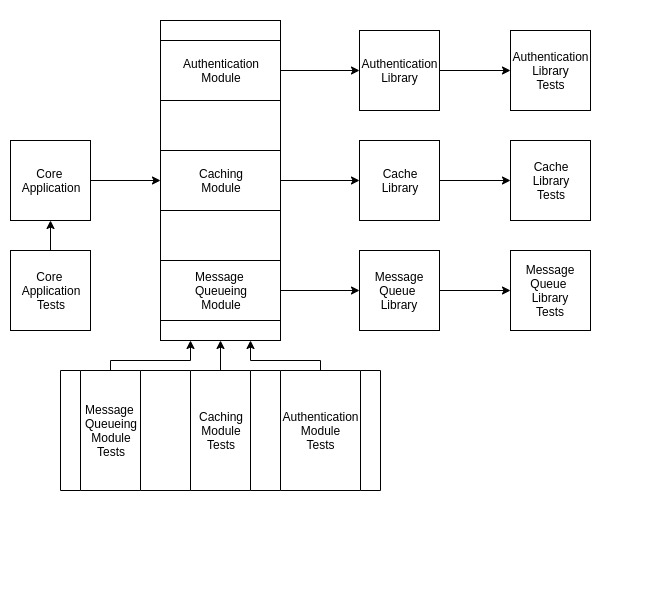 您将构建如下所示的库。所有的功能都将抽象为微服务,可以开发、测试,主框架将对外部服务进行集成测试,核心应用程序将进行自己的测试。