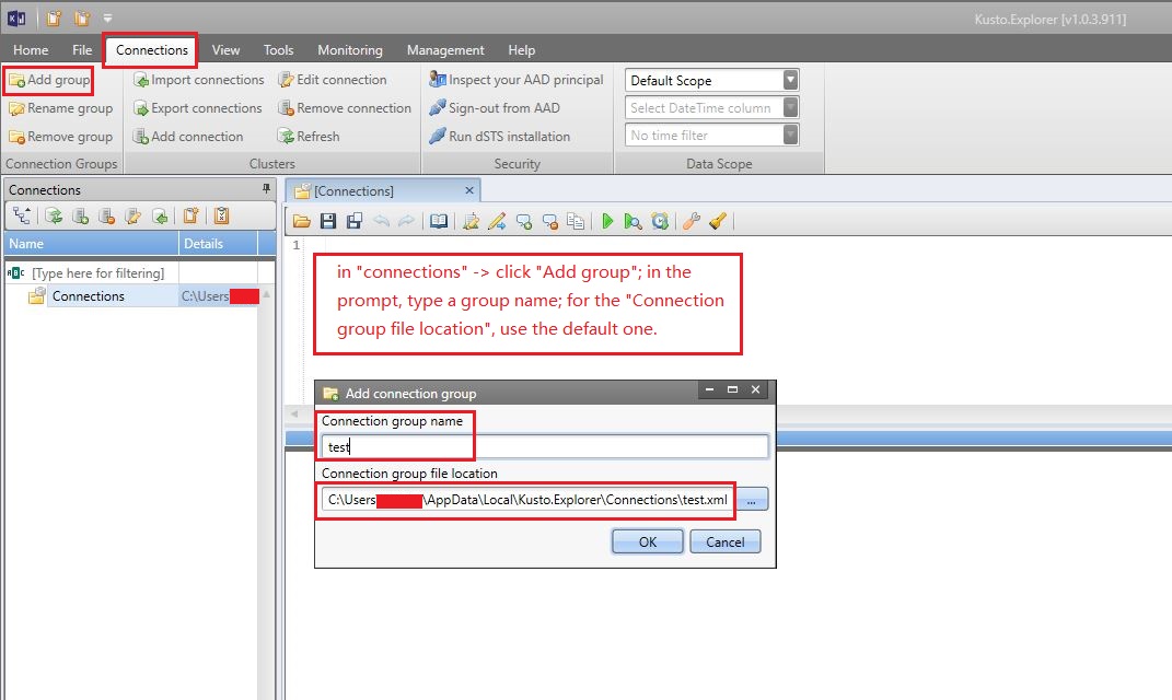 1.打开Kusto Explorer,在“连接”菜单->中选择“添加组”,然后按照下面的截图添加组: