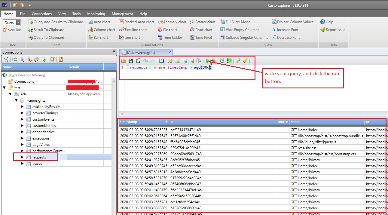 3.当连接正常时,您可以展开组,并且您的应用程序洞察力在那里;然后您可以编写查询代码来查询数据: