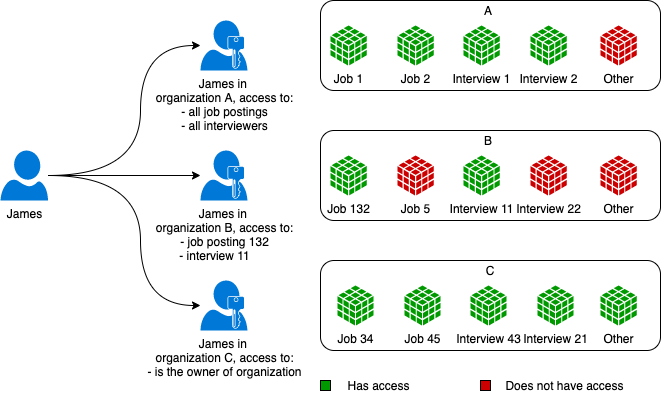 我们正在开发一个基于微服务架构的应用程序,用户可以是组织的成员,而在每个组织中,他们可能有基于资源的访问限制。例如,招聘人员是平台上几个组织的成员;在组织A中,他们可能会看到所有职位公告和面试官的列表,而在组织B中,他们只能看到他们可以直接看到的招聘公告。