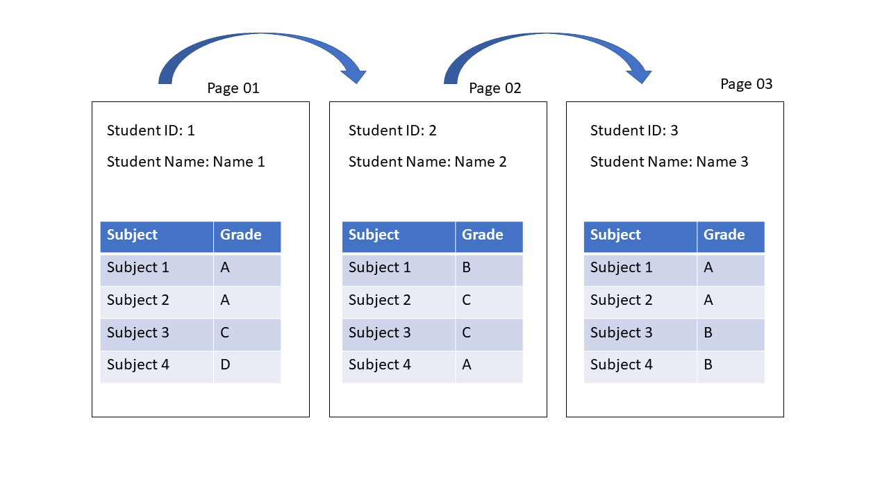 我有两个表,叫做“学生详细信息”和“学生成绩”。“学生详细信息”中的“学生详细信息”中的“学生ID,学生名称”我真正的要求是,当我给出一系列学生时,我想要为给定范围的学生填充一份带有多页内容的Jasper报告,以便在每一页中以图片形式显示他们的考试成绩(年级)。