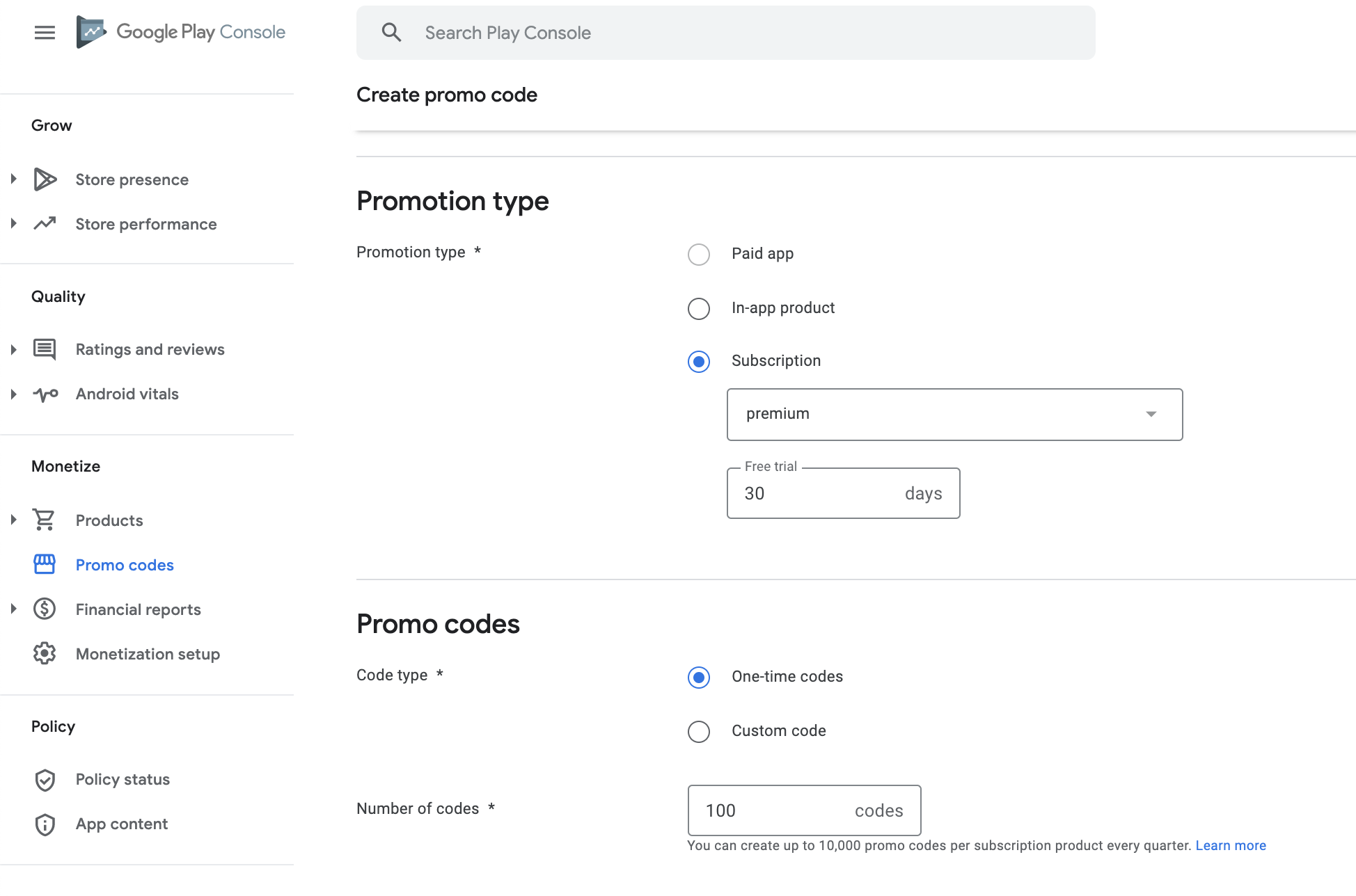 在这里我们可以通过给用户一个免费的试用期而在订阅上进行促销。我在游戏控制台里做了促销活动。但是,当我购买订阅时,我无法添加赎回代码或促销代码(我的应用程序是否需要在生产中,或者我也可以在alpha轨道上进行测试)。