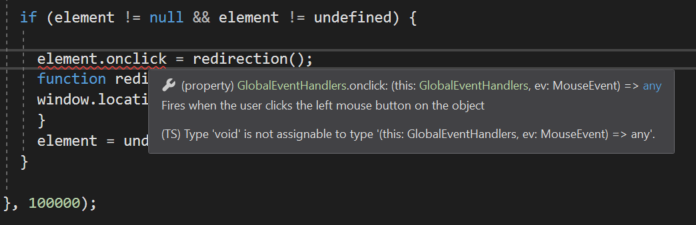 element.onclick = redirection();不是你想要的,是吗?这意味着您要将onclick事件处理程序设置为redirection()的结果,该结果碰巧是未定义的(因为它是一个空函数)