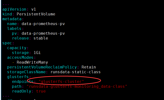 我有两个名称空间'runsdata‘和’监控‘。heketi和glusterfs的daemonSet荚都位于“runsdata”命名空间下。现在,我想在“监视”命名空间下创建Prometheus监视器。因为我需要存储普罗米修斯的数据。因此,我创建了PVC (在‘监控’ns下)和pv,在PVC yaml中,我声明存储库来创建相应的卷,以便为Prometheus提供存储。但是当我创建pv绑定并应用prometheus-server.yaml时。我知道错误: