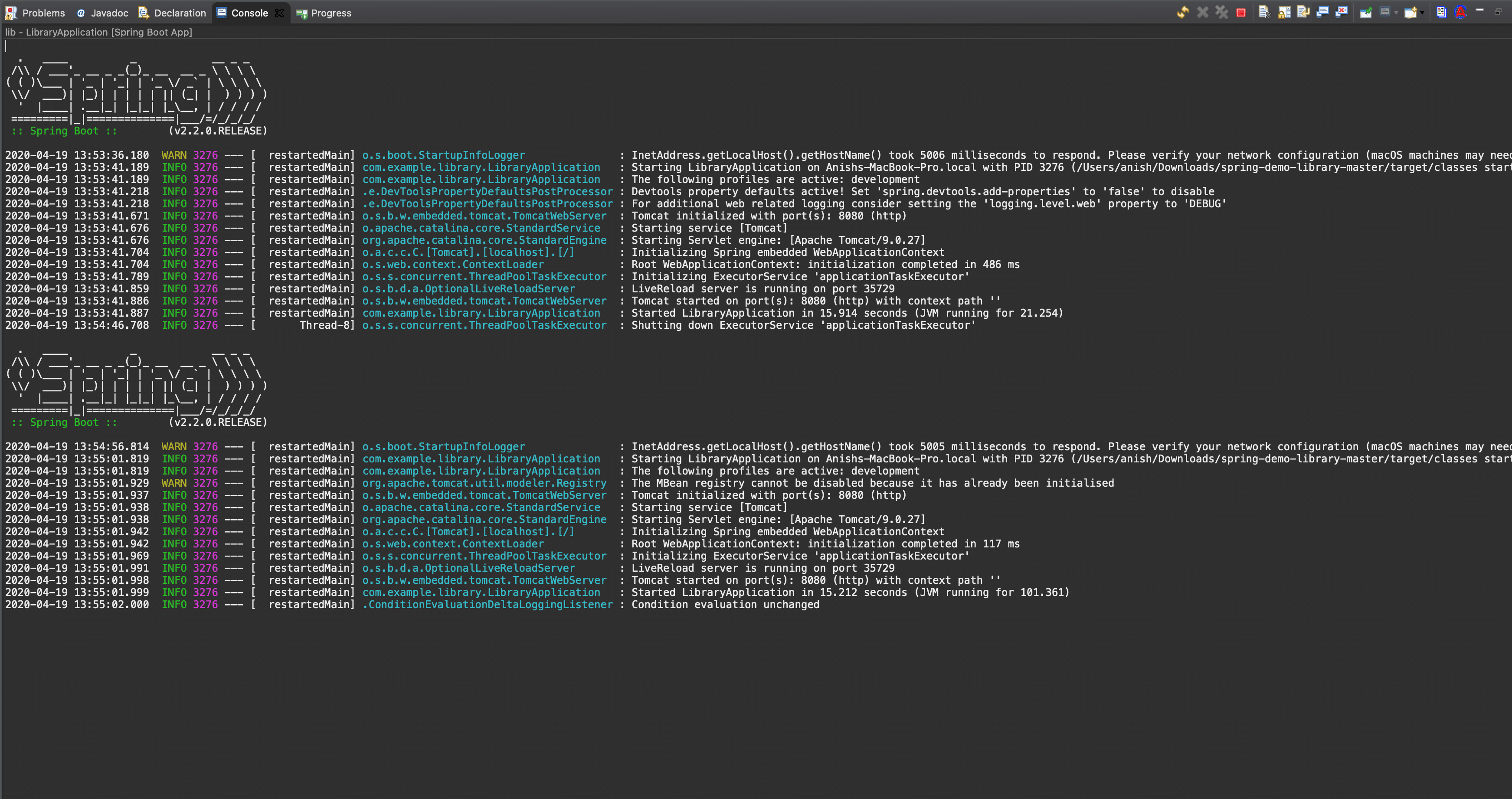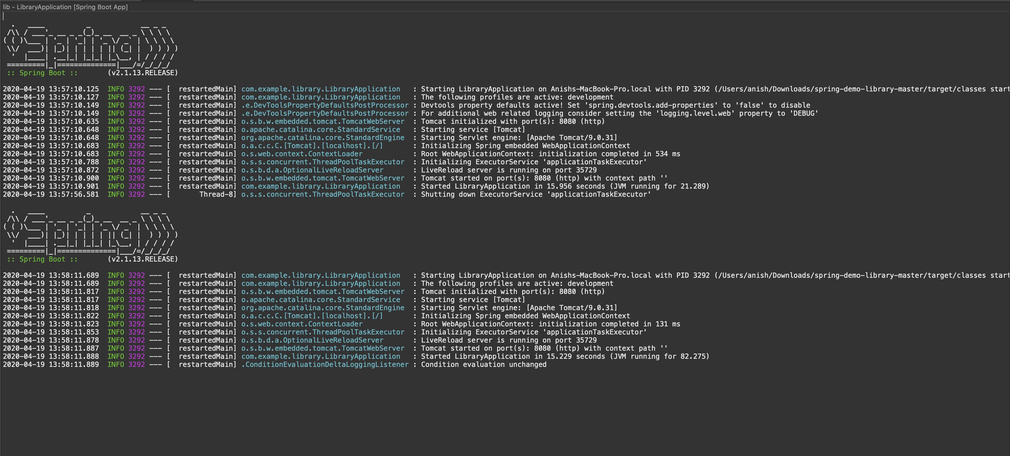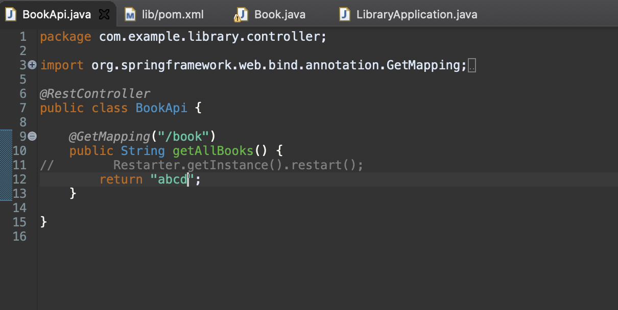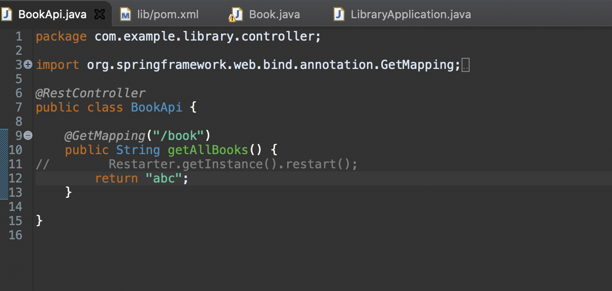 更新1:我为任何人创建了一个演示应用程序,以查看它是否适用于他们。下面是存储库。尝试使用mvn spring-boot:run运行它,并在运行时编辑BookApi.java,重新构建,它应该会触发实时重启。