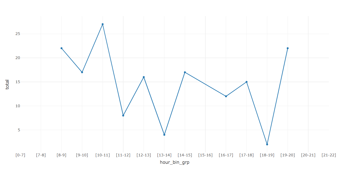 example_df <- data.frame(hour_bin_grp = bin_df$hour_bin_grp[bin_df$hour_bins %in% c('[8-9]','[9-10]','[10-11]','[11-12]','[12-13]','[13-14]','[14-15]','[16-17]','[17-18]','[18-19]','[19-20]')], total = as.numeric(c('22','17','27','8','16','4','17','12','15','2','22')))