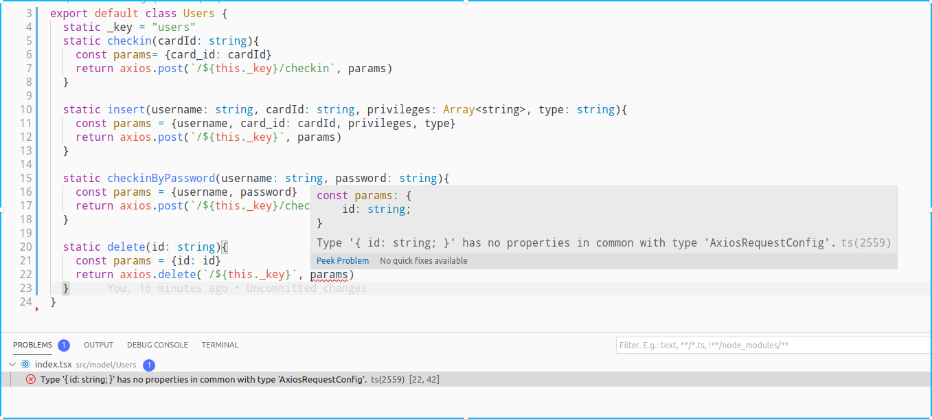}第一个函数(checkinByPassword)工作得很好。第二个函数使ESLint ( ESLint用于VSCode编辑器)抛出一个错误: