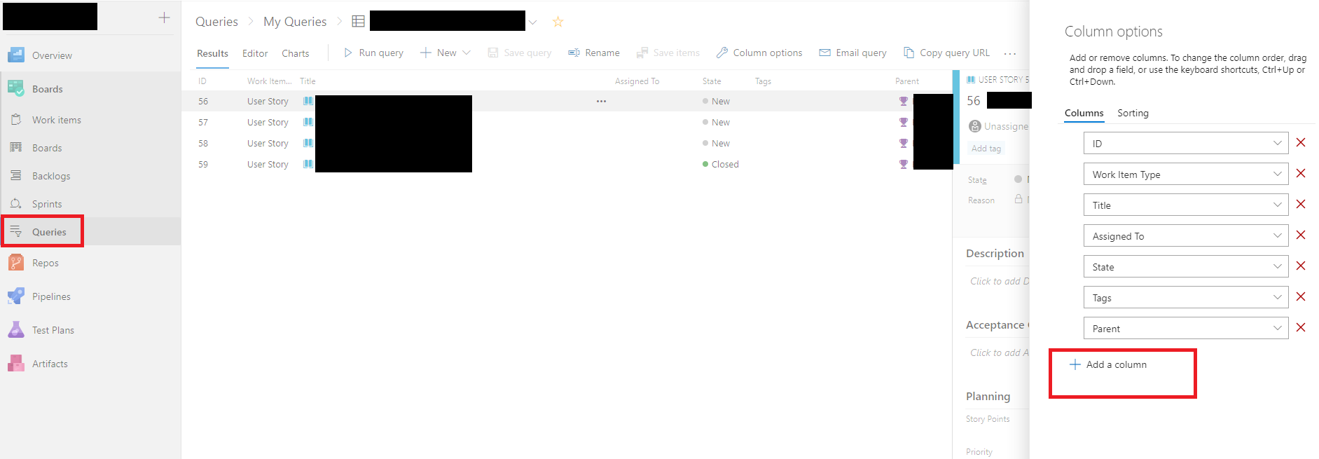 但是,我注意到如果单击“查询”,就没有“添加汇总列”。如何配置Azure DevOps,使“添加汇总列”显示在“添加列”之下?