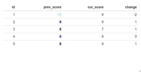 5 8 9 1我想根据prev_score列的值对change列单元格进行颜色化。例如,if df$change[i] > 0、df$prev_score[i]细胞颜色应为深蓝色,if df$change[i] == 0、df$prev_score[i]细胞颜色应为蓝色,if df$change[i] < 0、df$prev_score[i]细胞颜色应为浅蓝色。
