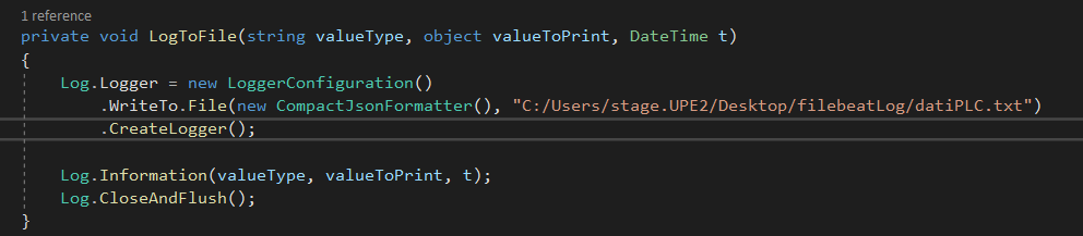 {"@t":"2020-02-19T13:34:55.6398202Z","@mt":"Stringa random {stringToLog}","stringToLog":"this"}这是我用来生成日志的方法: