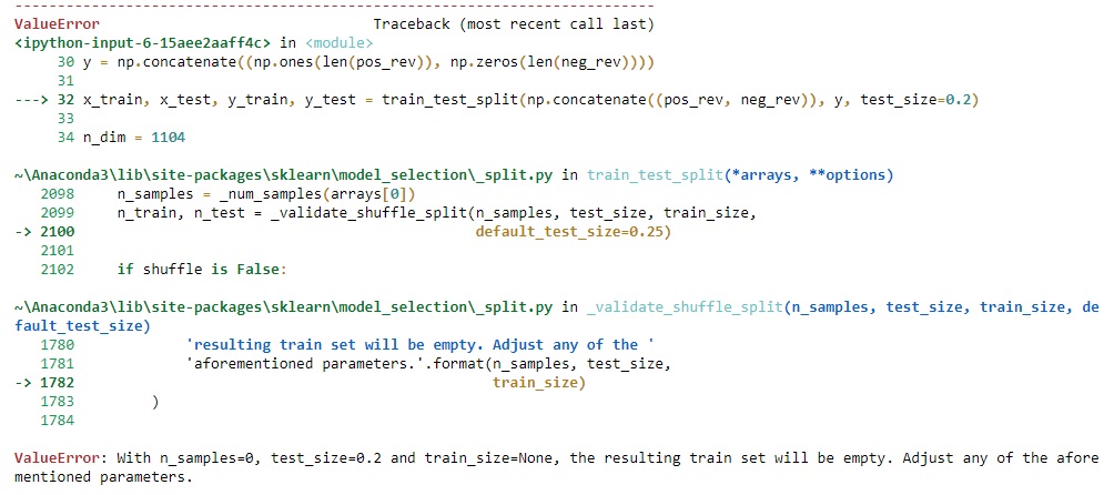 得到了同样的错误:ValueError: With n_samples=0, test_size=0.2 and train_size=None, the resulting train set will be empty. Adjust any of the aforementioned parameters.