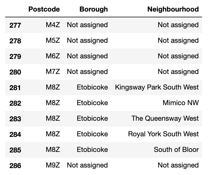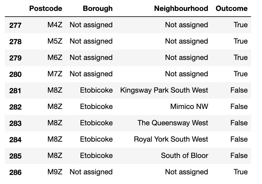 (df['Neighbourhood'] == 'Not assigned'))]然后,对样本数据集的结果是: