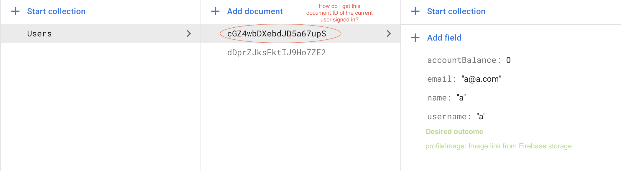 我正在尝试将一个图像上传到Firestore,并在我当前已通过身份验证的用户的Fi还原文档中创建上传图像链接的引用。当我试图找到当前通过身份验证的用户的文档ID以便能够保存图像引用链接时,我一直在挣扎。