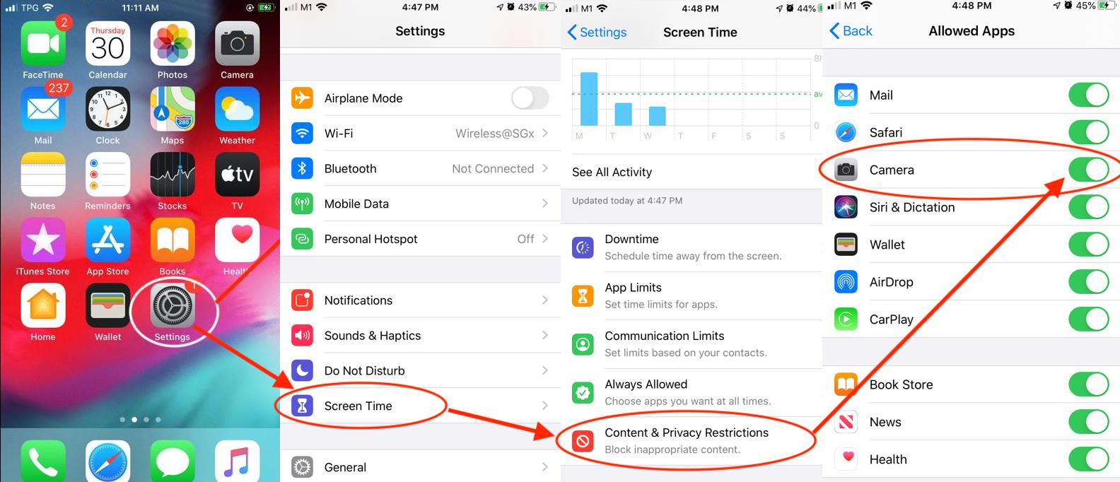 设置>屏幕时间>内容和隐私限制>允许的应用程序>摄像机>被关闭