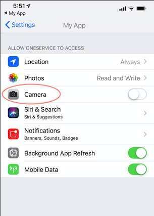 到目前为止,应用程序在所有iPhones中都运行得很好,除了iPhone 11 pro max。在iPhone 11 Pro max中没有提示用户获得相机权限,也没有在设置中显示和输入如下所示。